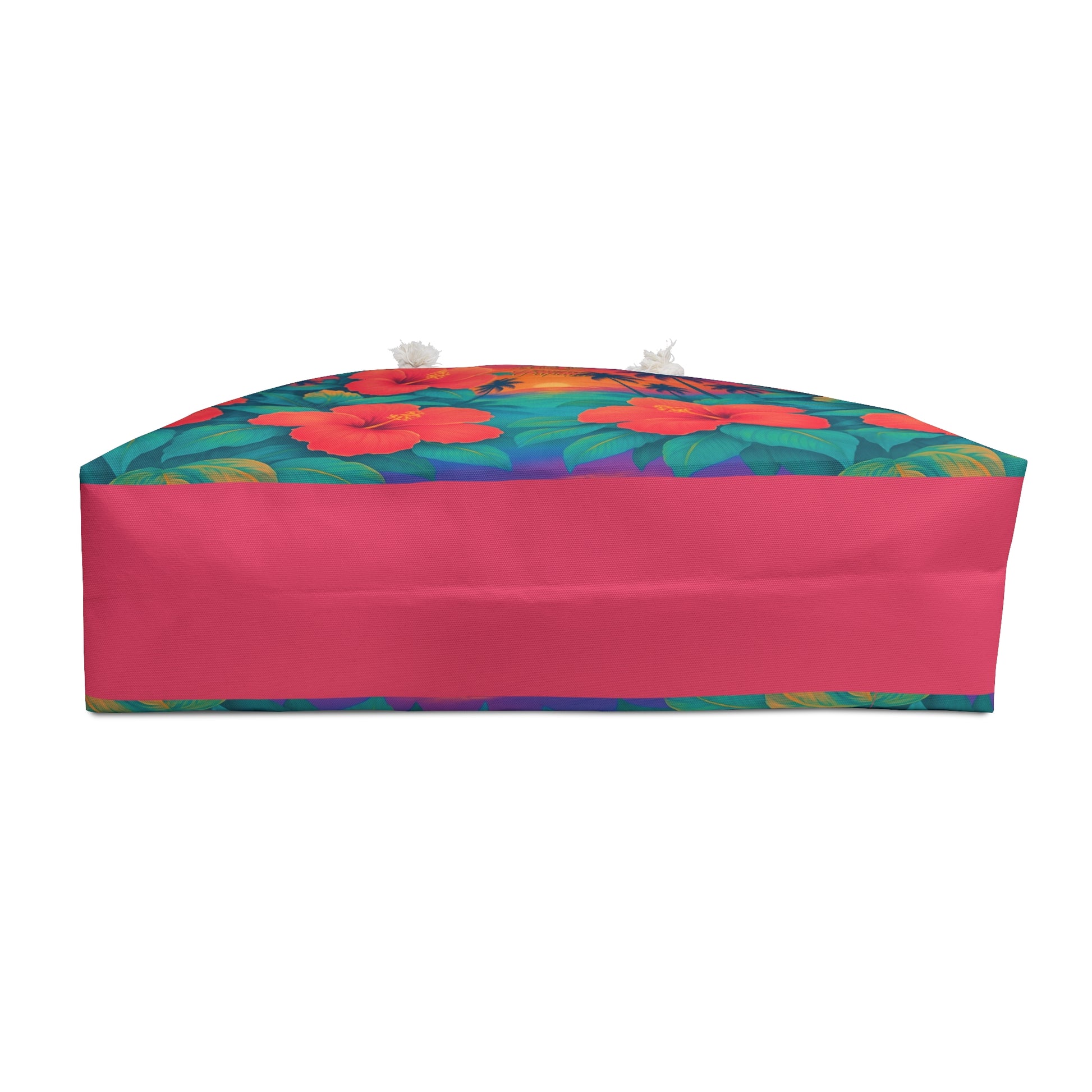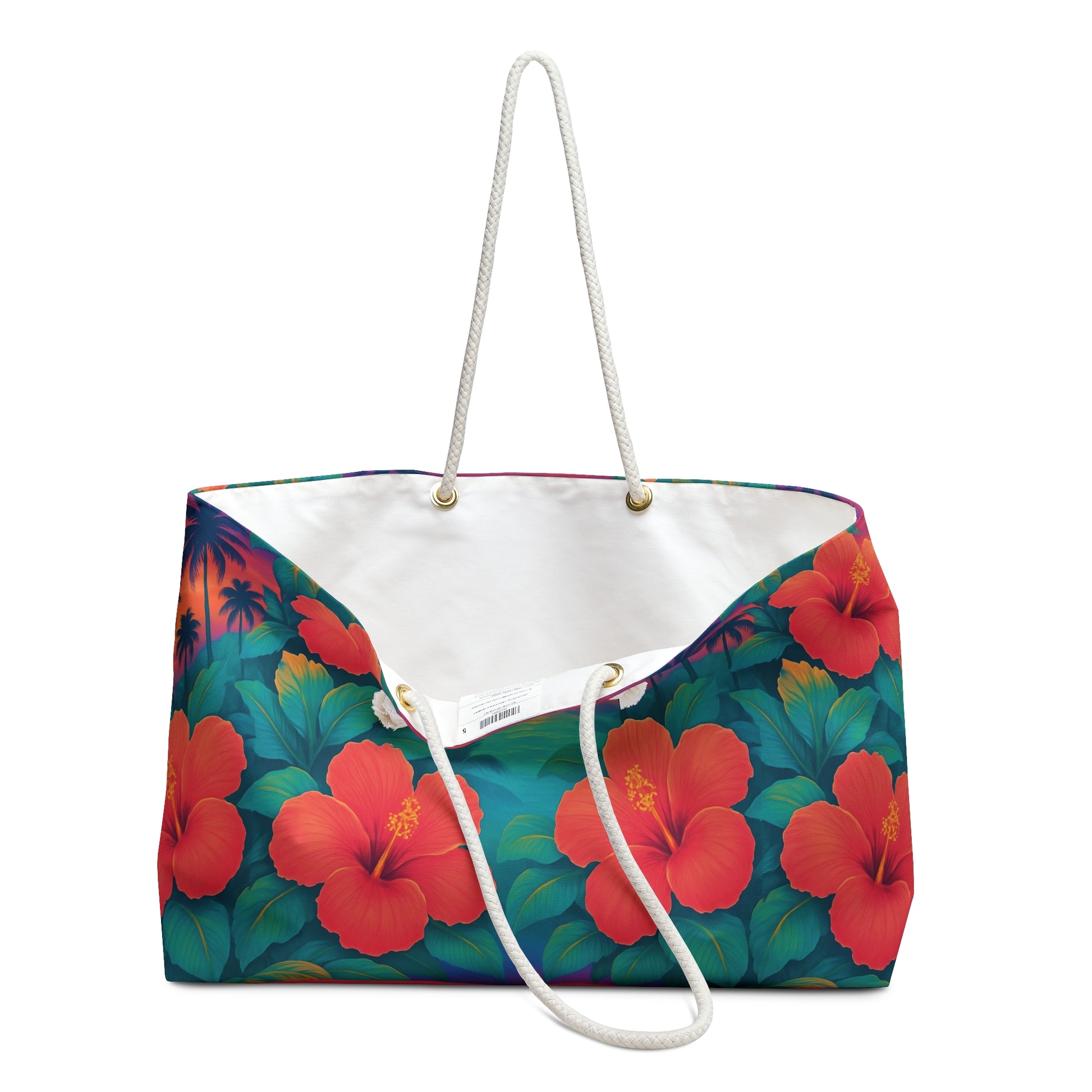 The Afterglow Weekender Tote is where bold florals meet golden hour magic. Wrapped in radiant red hibiscus blooms, lush tropical foliage, and a dreamy ombré sunset sky of pink, orange, and deep turquoise, this oversized tote turns your getaway into a moment.